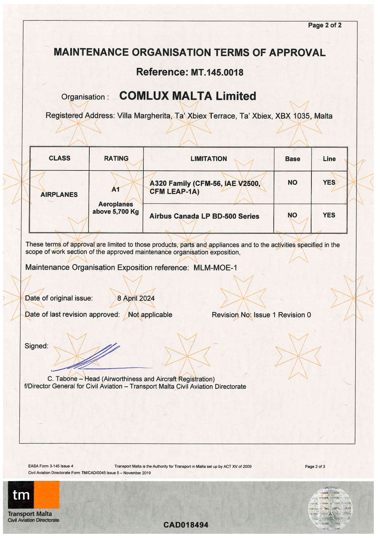 Malta - July 26, 2024 - Comlux Malta Ltd. has recently achieved EASA Part-145 certification from the Civil Aviation Directorate of Malta.